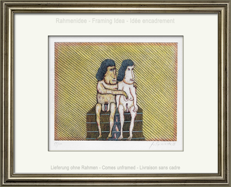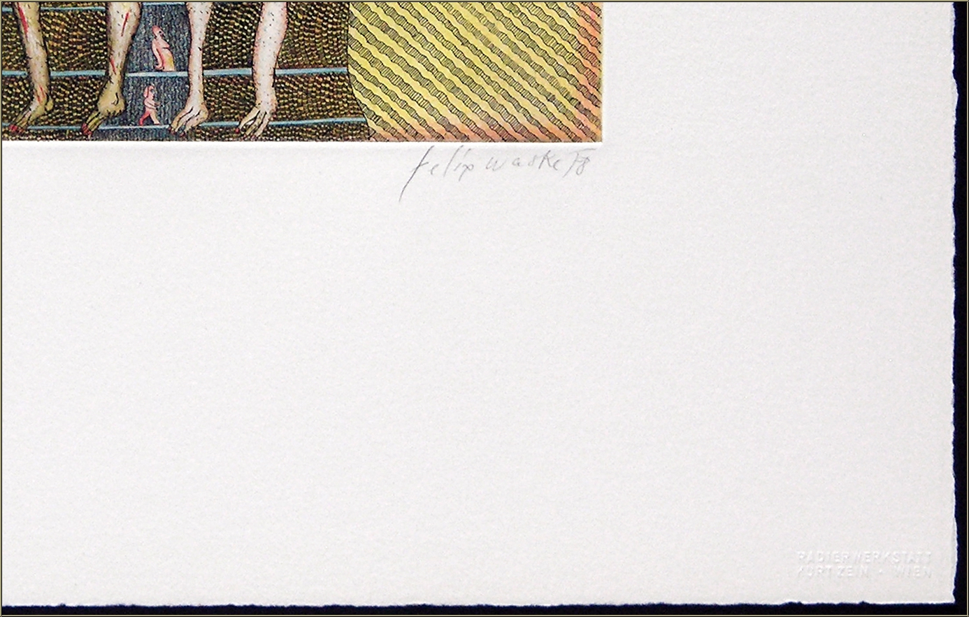 | | "Journey to Soul" - 1 Original etching in colors by Austrian artist Felix Waske on Arches wove paper. Signed, dated and numbered. | Year: | 1977 / 1978 | | Technique: | Dry-point etching with aquatint and vernis mou | | Sizes: | 33 x 34,5 cm (sheet), 15,5 x 19,5 cm (image) | | Edition | Paper: | One of 100 signed, dated and numbered impressions on Arches wove paper with wide margins. | | Signed: | in pencil lower right | | Publisher: | Edition Brusberg, Hannover (Germany) | | Printer: | Radierwerkstatt Kurt Zein, Vienna | | Remarks: | One of in total 12 works for the portfolio "Kupferne Erzählungen" (Copper Stories), made between 1975 and 1977. They were pulled from the hand press, and the copper plates were cancelled (destroyed) afterwards. | Documentation/ References: | Brusberg-Berichte 24, Hanover, 1978, p. 63-72 This print is being delivered with a copy from the a.m. catalogue (in German). | | Condition: | Read more An almost flawless impression from the archives. Frame not included in delivery. | Customer Reviews: This item has not been rated, yet. Customer ratings may only be submitted by customers who have bought this item and are logged in. Your name will, of course, be displayed anonymized (e.g., "Tom H., United Kingdom").  *Applies to deliveries to Germany paid via PayPal. In case of payment by bank transfer, delivery will take 1-3 days longer from the day of your banker�s order. Delivery times for other countries and information for estimating the day of delivery can be found here |