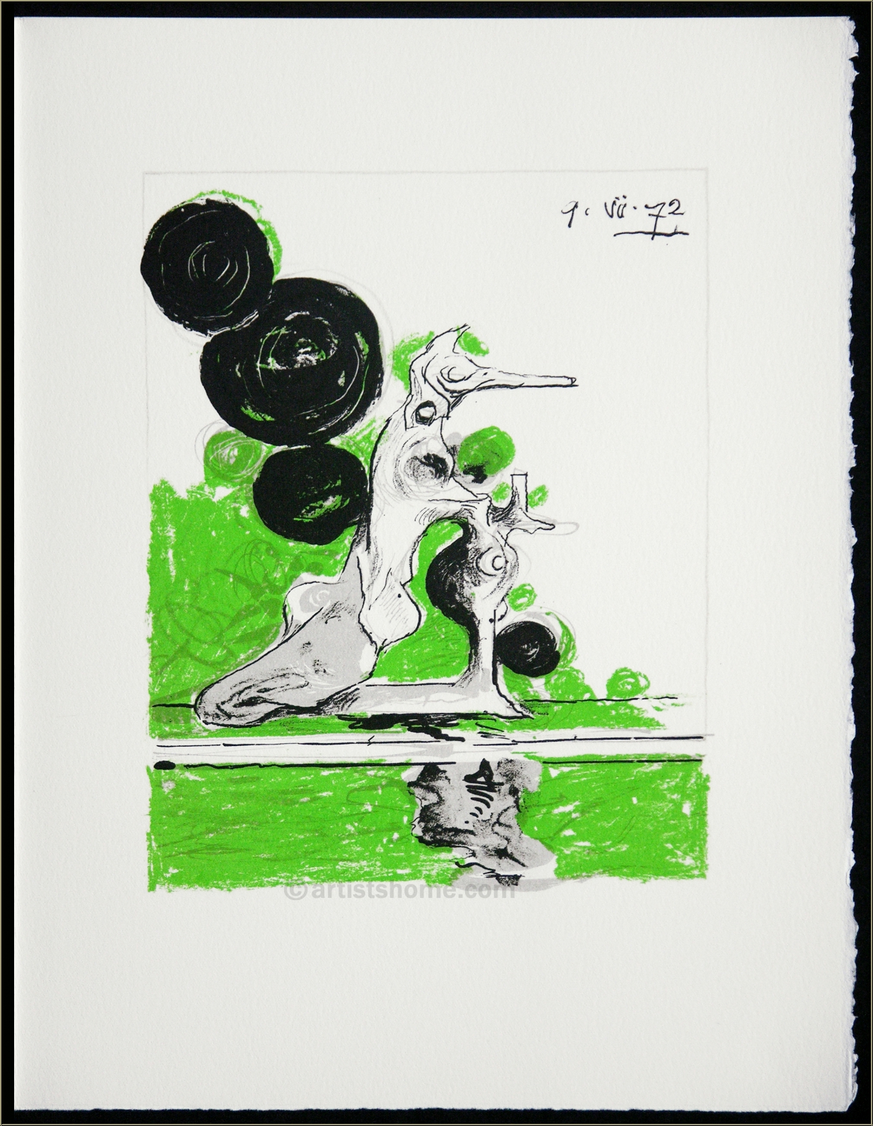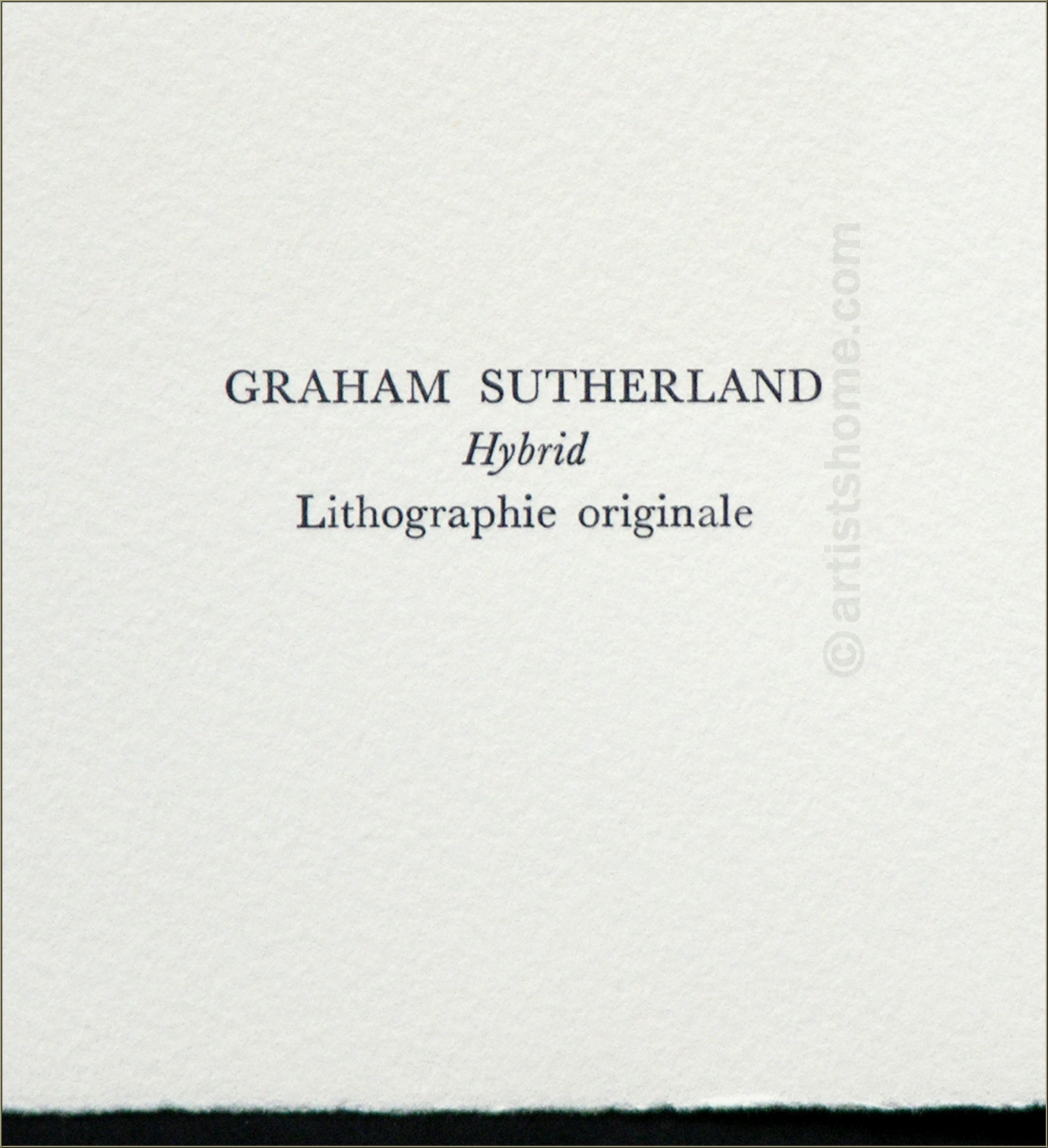 | | | | "Hybrid" - 1972 Original lithograph on Arches by Graham Sutherland for Fernand Mourlots portfolio "Souvenirs et portraits d'artistes", dated on the stone. This is N O T a mass-produced art print (e.g. offset or grano lithograph from a later "Limited edition") but the original lithograph in colours from the collector's de luxe edition of the a.m. portfolio. WARNING: There are currently very similar-looking prints sold on the internet, at small prices. These are unauthorized reprints (pirated copies) an NO original lithographs! | Edition: | One of 800 unsigned impressions for the "de luxe" edition, published in 1972 | | Size: | 32,5 x 25 cm (sheet size) | | Published by: | Alain C. Mazo, Paris and Léon Amiel, New York, 1972 | | Printed by: | Mourlot, Paris | | Remarks: | Text on the reverse: "Graham Sutherland - Hybrid - Lithographie originale" | Documentation/ References: | https://mourlot.com: "Livres de Fernand Mourlot" (in French language) Your print is being delivered with a certificate of identity (without selling price in case this print is intended as a present). | | Condition: | Read more A flawless impression from the archives. Frame not included in delivery. | | | Customer Reviews: This item has not been rated, yet. Customer ratings may only be submitted by customers who have bought this item and are logged in. Your name will, of course, be displayed anonymized (e.g., "Tom H., United Kingdom").  *Applies to deliveries to Germany paid via PayPal. In case of payment by bank transfer, delivery will take 1-3 days longer from the day of your banker�s order. Delivery times for other countries and information for estimating the day of delivery can be found here |
