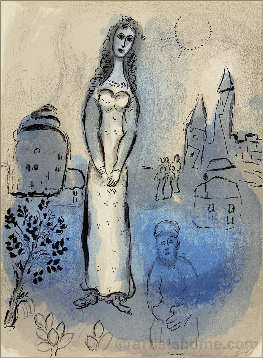 Details:"Esther" For this work, Chagall depicted Esther larger than life, gracefully and stunningly beautiful, in mellow tints of blue and beige. She almost seems to be floating. In this way, he pays tribute to one of the greatest women of the people of Israel. Thanks to her beauty and great personality, Esther became the queen at the court of the Persian King, Artaxerxes, after he had cast out his wife because of disobedience. Esther's uncle Mordechai, who also lived at the royal court, uncovered a conspiracy against the King and in doing so saved his life. But Haman, the highest court official, enviously hated all Jews. He obtained a writ from the King allowing him to extinct all Jews in the kingdom. Mordechai begged Esther to intercede with the King. She went to the King even though she was banned from doing so under threat of the death penalty. She successfully changed the King's mind, and this was how she saved her people from being wiped out. To this day, the Jewish holiday, Purim, reminds of Esther's great and couragous achievement. She risked her life for the Jewish people. In the lower part of the painting, we can also see Mordechai. He looks sorrow-stricken, his hands appear to be tied. His future seems grey and sullen, but there are signs of life and hope: the sun, plants and a tree.