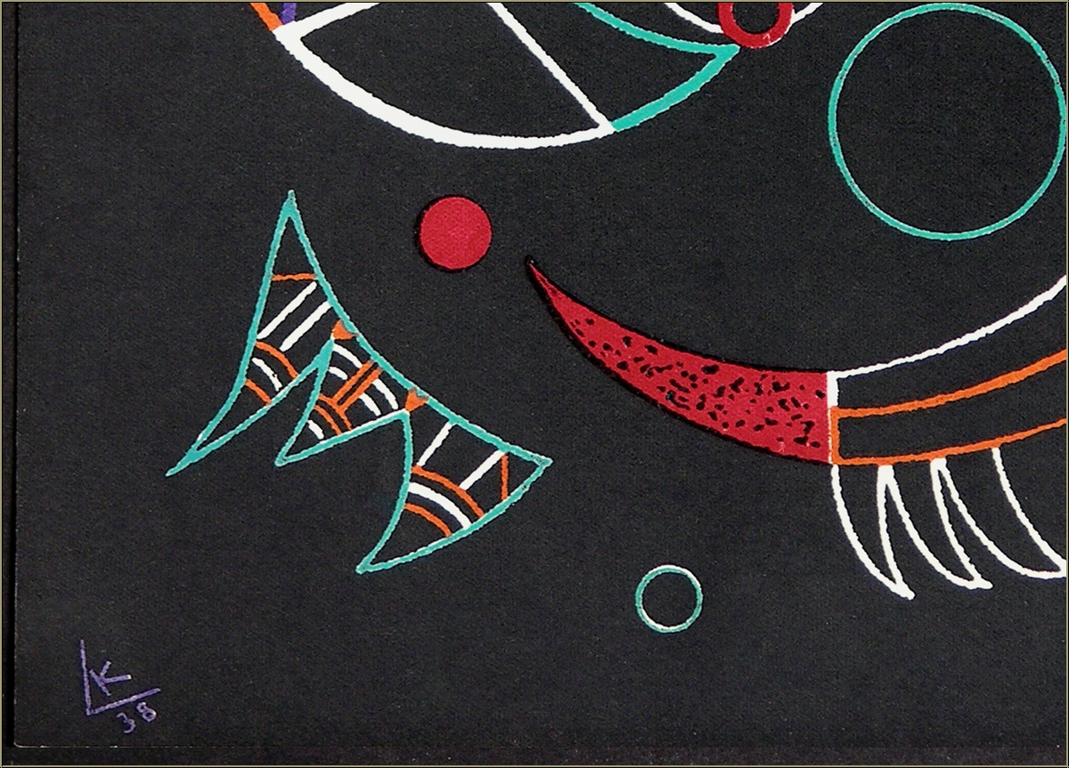 | | | Technique: | Lithograph in colours, printed by Mourlot This is N O T a mass-produced photomechanical reprint but the lithograph for the 1938 issue of the French art magazine "Verve". | | Year: | 1938 | | Sizes: | 35 x 25 cm / 13.7" x 9.8" (sheet) | | Edition | Paper: | One of approx. 2000 unsigned impressions for the book edition on smooth velin paper. There are no signed impressions. | | Published by: | Tériade, Paris | | Printed by: | Mourlot, Paris | | Remarks: | Text on the reverse: the title "Comets" as well as "Lithography by Kandinsky" respectively "Comètes" and "Lithographie par Kandinsky", as published in 1938 for the English and French editions. | | Documentation / References: | - Anthonioz, M., Verve. The Ultimate Review of Art and Literature (1937-1960), Abrams, N.Y., 1988, pages 55-56 and 387. - Derouet, C. Oeuvres de Vassily Kandinsky. Collections du Musée national d'art moderne, Centre Georges Pompidou, 1984, page 359, No. 10 Your print is being delivered with an abstract from the a.m. documentations. In addition, you'll receive a proof of identity (without selling price) in case this print is intended as a present. | | Condition: | Read more A well-preserved, superb impression from the archives - rare in this condition! Frame not included in delivery. | Customer Reviews: This item has not been rated, yet. Customer ratings may only be submitted by customers who have bought this item and are logged in. Your name will, of course, be displayed anonymized (e.g., "Tom H., United Kingdom").  *Applies to deliveries to Germany paid via PayPal. In case of payment by bank transfer, delivery will take 1-3 days longer from the day of your banker�s order. Delivery times for other countries and information for estimating the day of delivery can be found here |